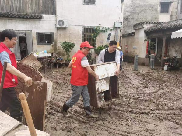 同样的场景也出现在安徽,在渔梁古镇老街,清淤工作正在紧张进行中。中国人寿寿险歙县支公司的员工宋英华、丁小龙就与十多家单位的志愿者一起拌匀障碍物,清扫淤泥。渔梁古镇是徽州古城的组成部分,距今已有1200多年历史。受强降雨影响,渔梁水位一度达到117米。暴雨过境后,岸边被水冲刷的痕迹清晰可见,在志愿者的辛劳工作下古镇的街道交通逐步通畅,当地群众的出行安全也得到了保障。